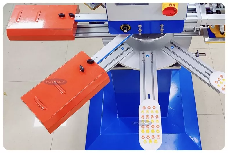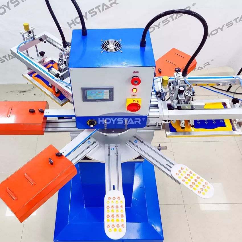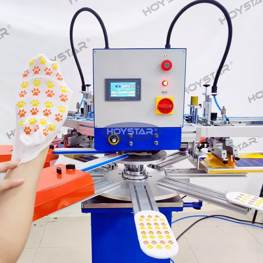 Som den professionelle producent og leverandør er HOYSTAR High Rapid 2 Color Socks Screen Printing Machine designet til applikationer i tekstilstrikkeindustrien. Med en hastighed på op til 1000PCS/Hr er den velegnet til print af skridsikre sokker, babysokker, voksenstrømper, fodboldstrømper osv. Udstyret med roterende arbejdsbord er det meget praktisk at i- og aflæse sokker. PLC touch screen kontrol, meget nem at betjene. Maskine udstyret med tørresystem kan tørre silicium og blæk godt.