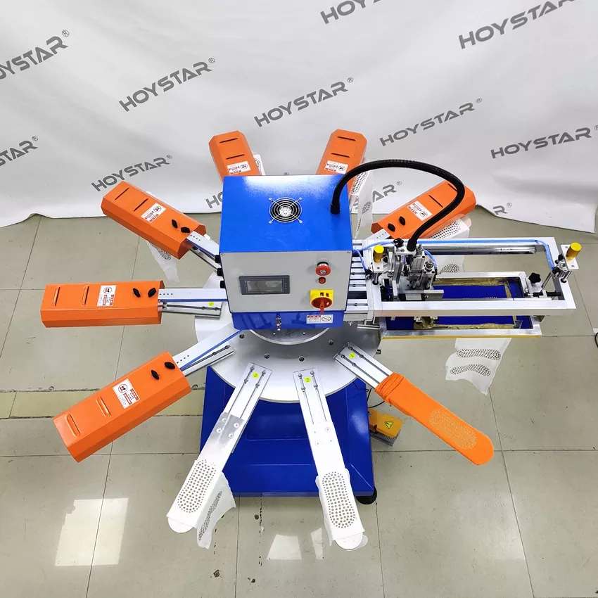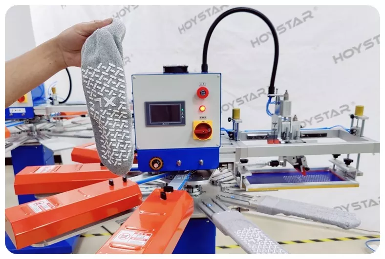 Som den professionelle producent i Kina vil vi gerne give dig højhurtig HOYSTAR serigrafimaskine til sokker. Vores maskiner anvender PLC og berøringsskærmstyring og bruges hovedsageligt til udskrivning af forskellige typer sokker. Maskinen kan printe på sokkernes såler og hæle og er udstyret med tørreovn, der kan tørre silicium og blæk godt.