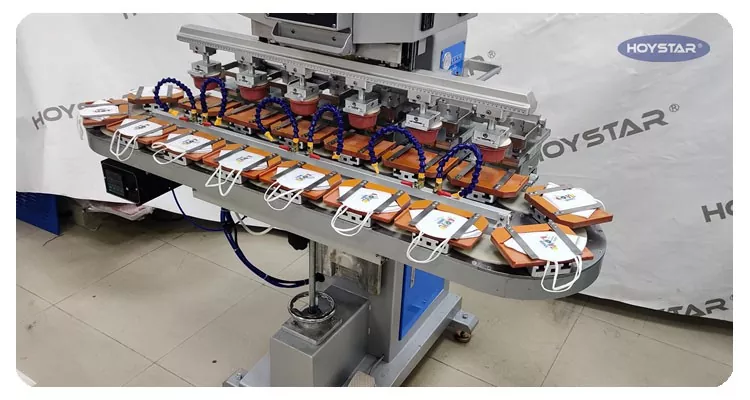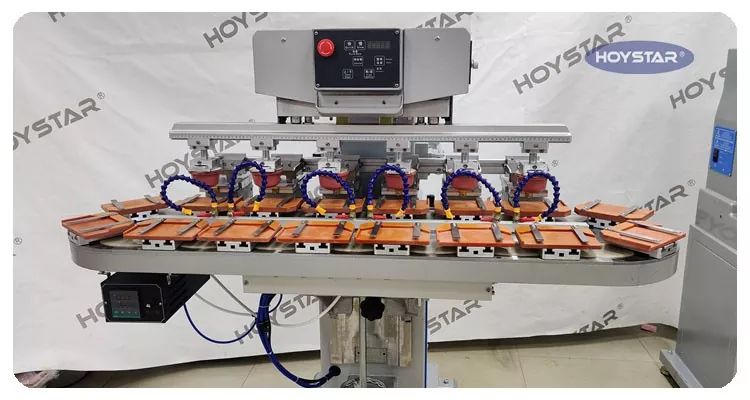 Som den professionelle producent i Kina vil vi gerne give dig højeffektiv HOYSTAR Six Color Pad Printer med transportbånd. Denne maskine muliggør kontinuerlig seks-farvet pad-udskrivning for produkter, med én farveregistrering gennemført i en enkelt cyklus. Denne maskine anvender roterende drejeskive-transportsystem, som muliggør kontinuerlig og jævn produktoverførsel gennem hele printprocessen, evnen til at fuldføre fuld 6-farve overprint på kun én roterende cyklus. Sammenlignet med shuttle-type pad-printere er dens hastighed meget hurtig.